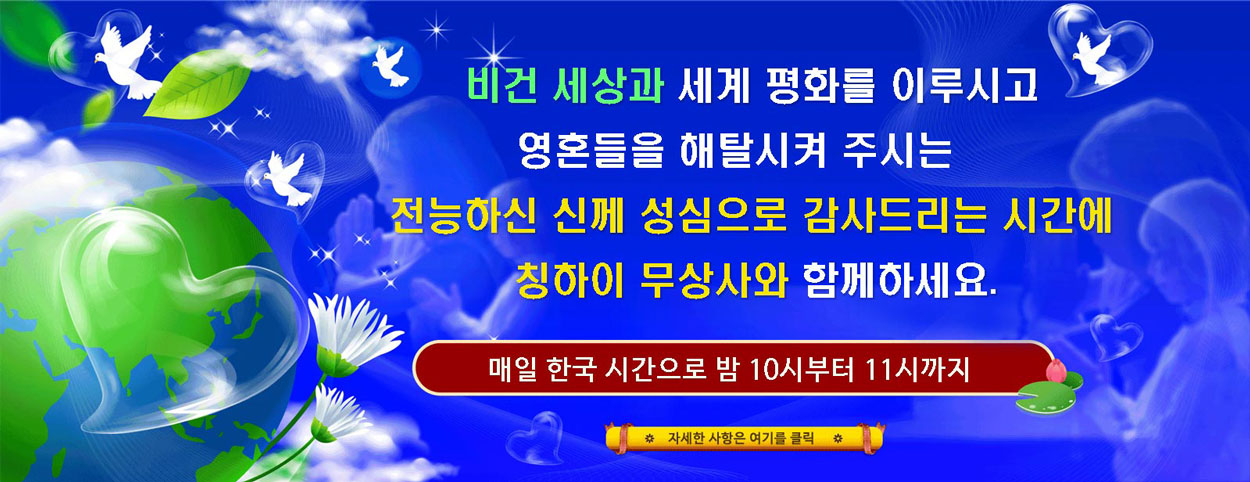 Featured Programs 더보기 더보기 57:18신께서 진정 전쟁을 허용하시는 것인가, 평화는 왜 이토록 더딘가, 2026년 3월 8일16:57마법의 책, 4부 중 1부3:25어머니 지구의 메시지를 전하고 스승님께 해탈가를 바치다7:35⭐ 종교 속의 관음 발자취 - 내면의 천국의 소리 명상, 3부 중 1부17:43우리 행성에 대한 오래된 예언 시리즈: 황금시대 예언 208부 - 도교의 위대한 성자인 스승, 노자(비건)의 재림에 관한 예언24:22『만물의 위대한 근원과 다시 하나 되기 위해 살아있는 스승을 찾으라』, 1부25:21칭하이 무상사(비건)의 노래와 작곡, 자작시, 공연, 다부작 중 24부5:35"비로자나 불"이셨던 스승님을 보다12:52COP27 참석자들에게 보내는 칭하이 무상사 메시지24:26황금시대 예언35부-미륵불과 용화회상 더보기